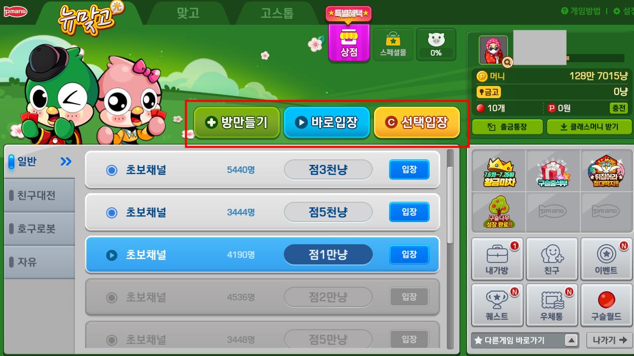 방을 새로 만들거나, 바로 게임에 입장을 하거나, 원하는 조건을 선택해 선택입장 할수 있습니다.