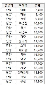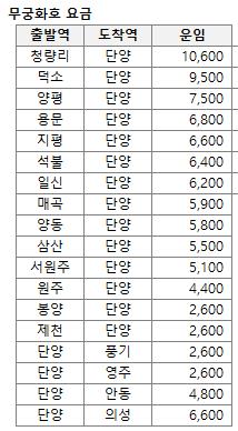 단양역을 출발하거나 도착하는 무궁화호 열차 요금입니다.