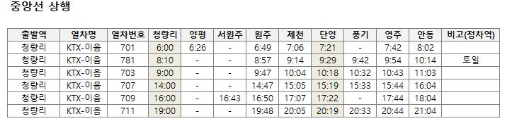 안동역에서 출발해 단양역을거쳐 청량리역까지 운행하는 KTX 하행선입니다.