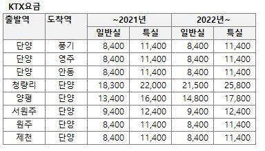 단양역을 출발하고 도착하는 KTX 열차 요금입니다.