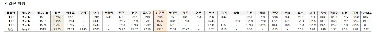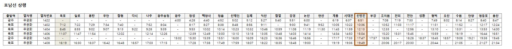 용산역에서 출발해 신탄진역-서대전역-계룡역-연산역-논산역-강경역-함열역-익산역-김제역-신태인역-정읍역-백양사역-장성역-극락강역-광주역-광주송정역-나주역-다시역-함평역-무안역-몽탄역-일로역-목포역까지 운행하는 열차 시간표입니다.