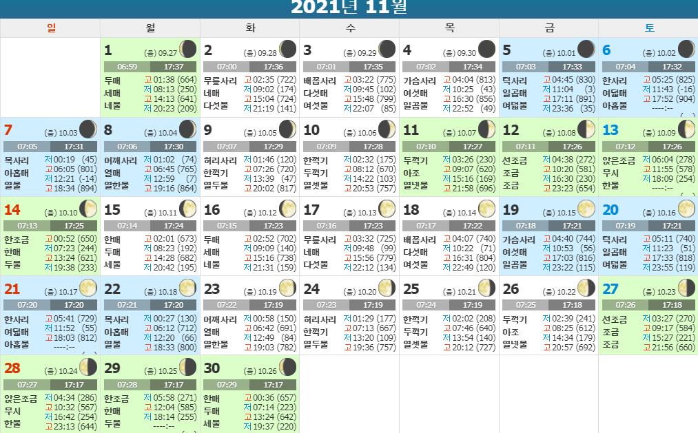 11월 19일,20일,21일,22일 일요일,토요일,금요일,월요일 물때 시간도 확인할수 있습니다.