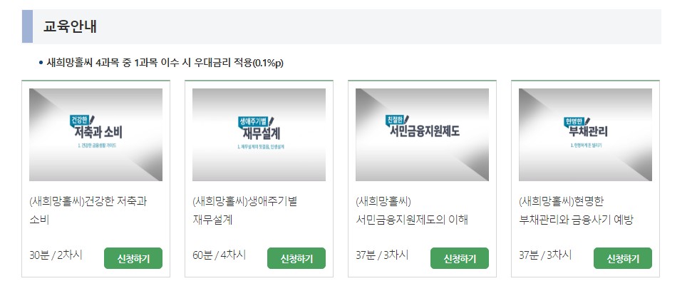 미소금융, 햇살론유스,햇살론15 안정망대출, 근로자 햇살론 햇살론뱅크,햇살론카드,새희망홀시,대학생 청년햇살론등 대출이용자는 정해진 과목수를 필수로 이수해야 대출을 받을수 있거나 일부 과정은 금리 할인 우대를 받을수 있습니다.