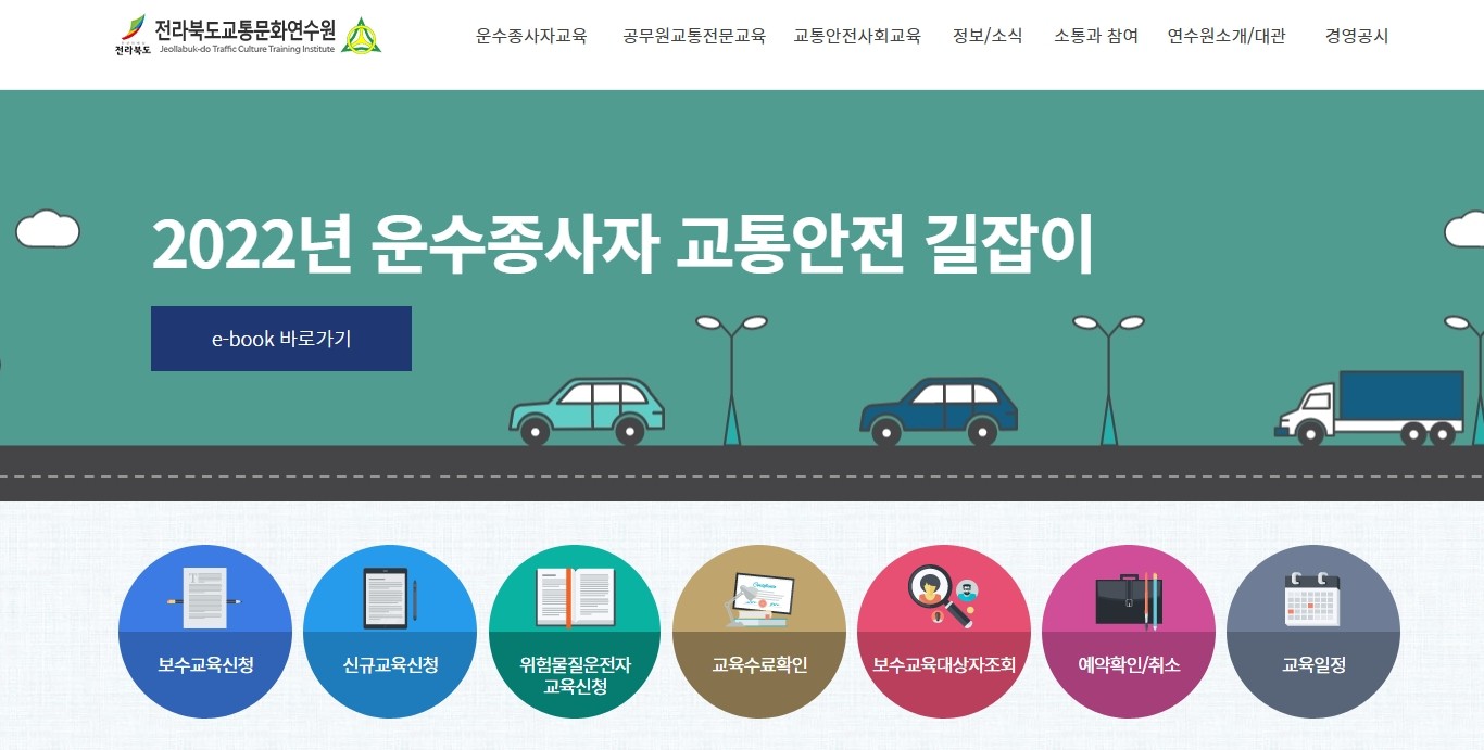 전리북도 교통문화연수원 홈페이지(www.jbtti.or.kr)에 접속하시면 전라북도 등록차량 화물 운송종사자들은 온라인으로 교육을 신청,이수 할 수 있습니다.
