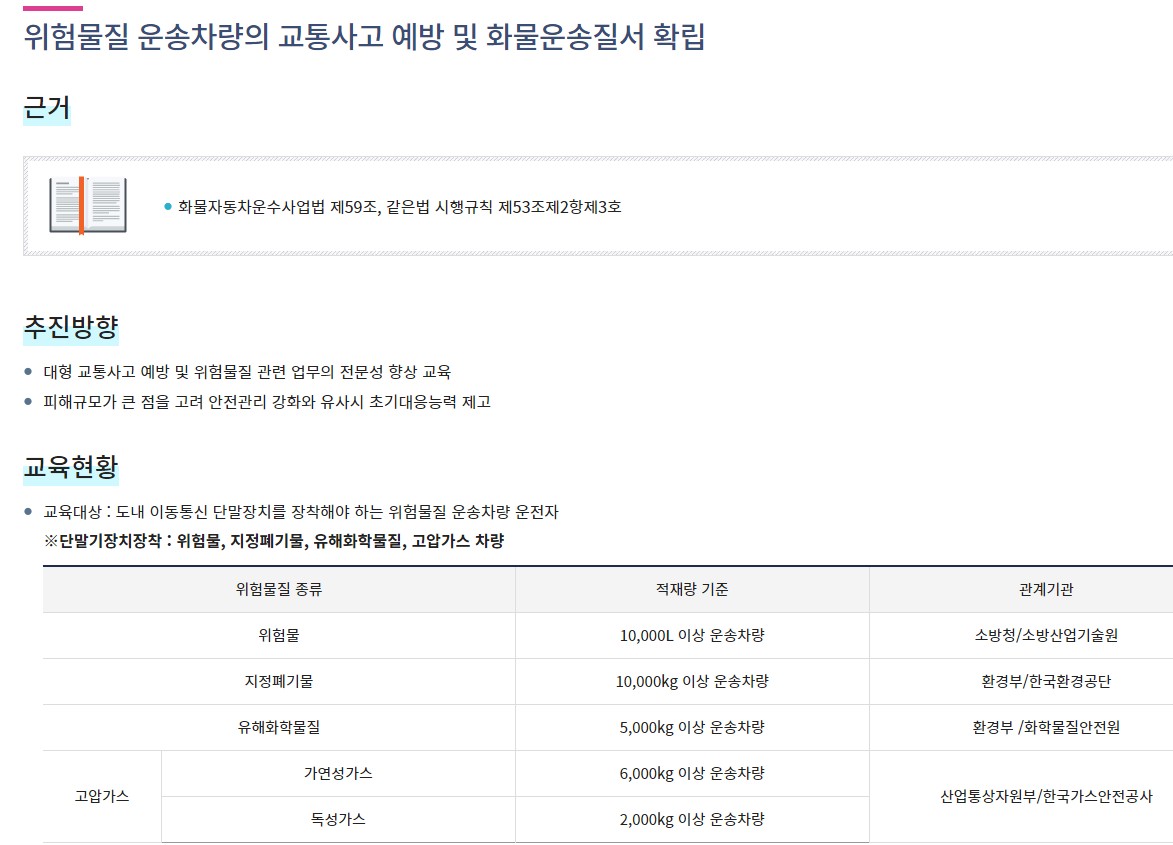 위험물질 운반자의경우 위험물질 운송차량 보수교육을 신청해 이수해야합니다.