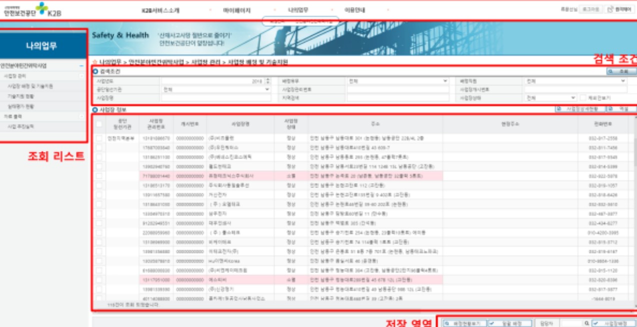 사업장에 대한 기본정보와 기술지원현황등을 상세하게 조회 할수 있습니다.