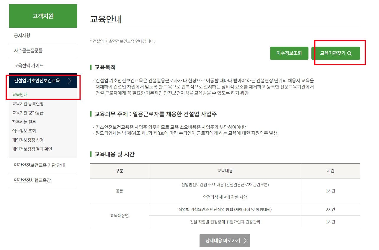 안전보건교육포털 홈페이지(www.koshats.or.kr)에 접속하면 건설업 기초안전보건교육 신청과 이수 확인등을 할수 있습니다.