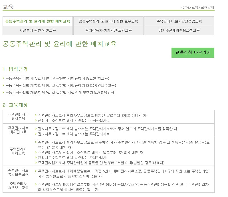 공동주택관리 및 윤리에 관한 배치교육과 보수교육,안전점검교육,관리감독자 정기안전 보건교육,장기수선계획 수립조정교육등이 있으며 각 교육마다 의무적으로 교육을 이수해야하는 경우가 많습니다.