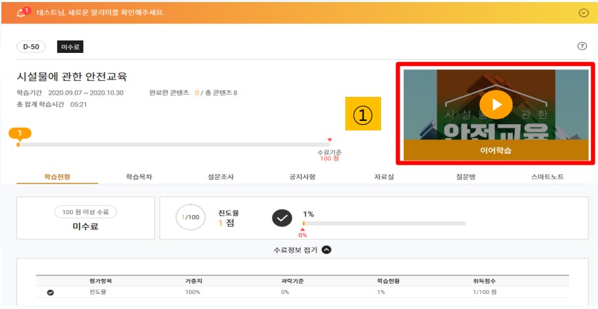 교육과정 100% 달성할경유 교육 수료처리가 됩니다.