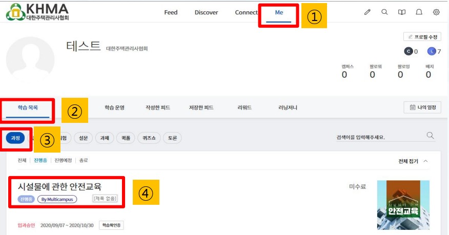 [me]선택후 [학습목록]-[과정]으로 이동하면 내가 신청한 교육을 확인할수 있습니다.