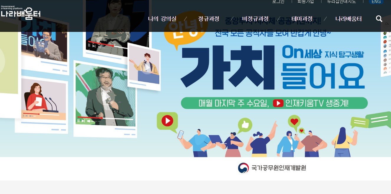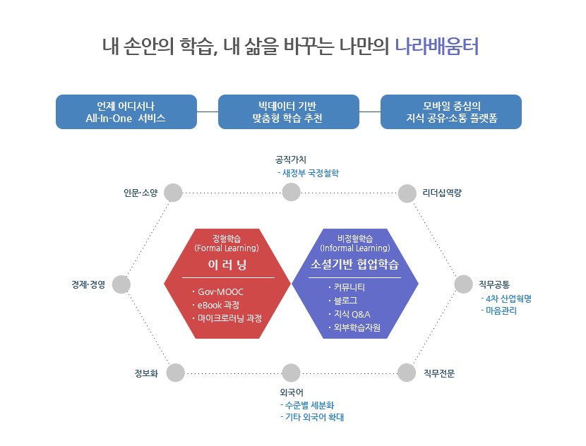 미래지향적 공무원 양성을위한 목적으로 다양한 분야의 콘텐츠를 제공하고 있으며 빅데이터 기반의 개인맞춤형 추천,소통기반 협업학습 서비스,외부학습지원제공등 학습 효과 극대화를 위한 수요자 중심의 맞춤형 교육 플랫폼입니다.