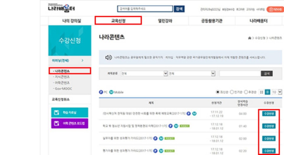 공무원,민간인으로 회원가입후 [나의 강의실]에서 [교육신청]을 통해 내가 원하는 강좌를 수강시청 할수 있습니다.