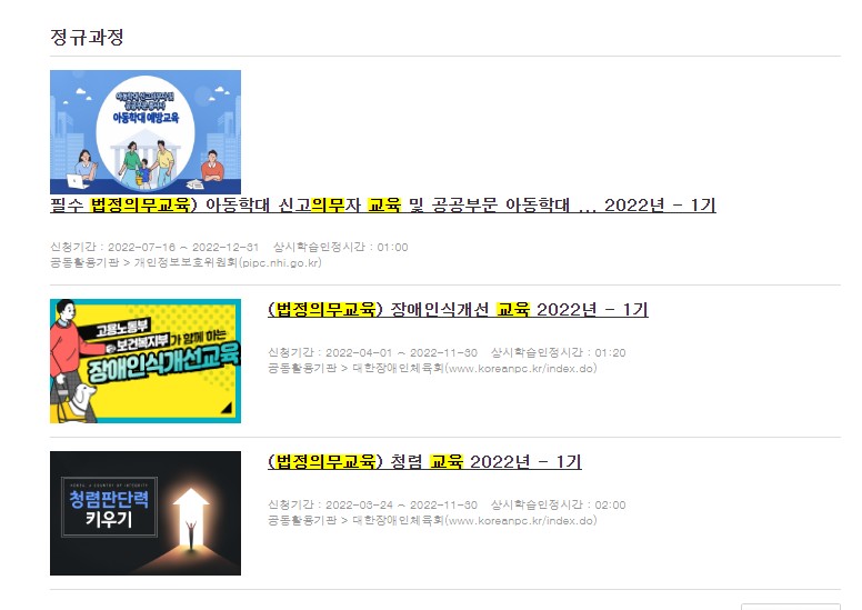 법정의무교육인 첨령교육과 아동학대 신고의무자교육,장애인식개선교육, 장애인학대 신고의무자 교육등을 온라인으로 이수할수 있습니다.