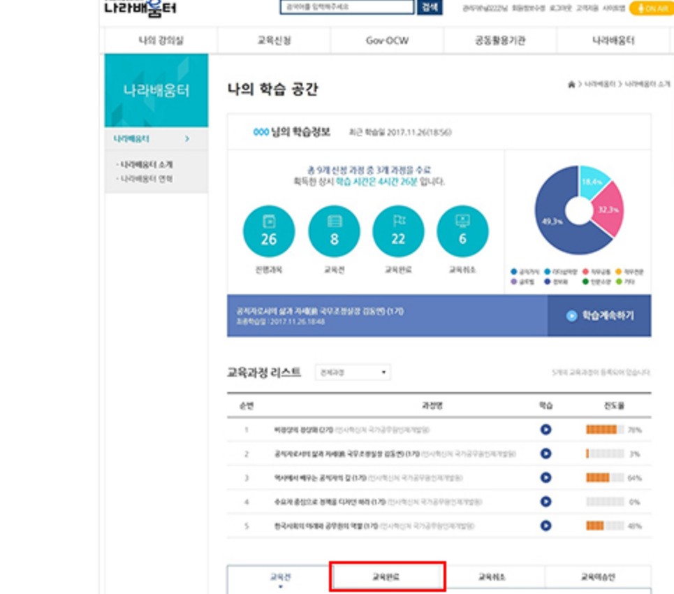 [나의 학습공간]에서 내가 신청한 교육의 학습정보와 진도율을 확인할수 있습니다.