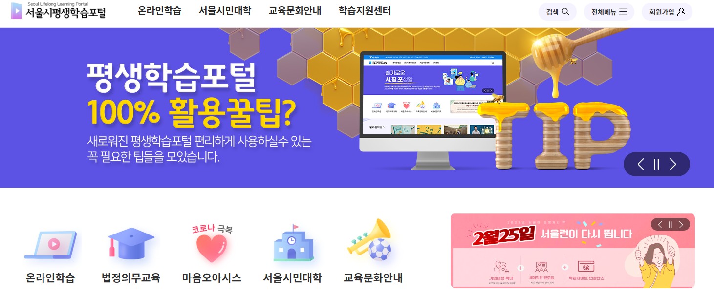 서울시 평생학습포털 홈페이지에서 다양한 온라인굥규과 법정의무교육,학습공간예약과 서울시민대학 참여 등을 할수 있습니다.