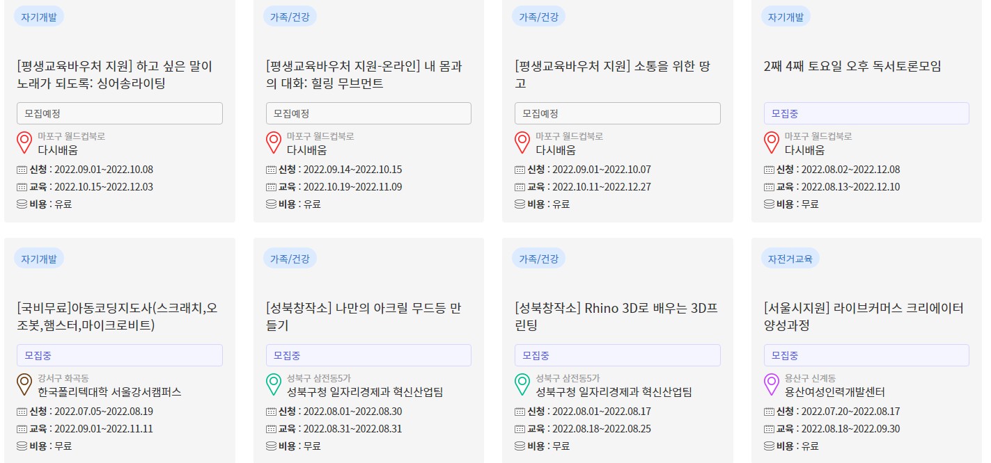 각 대학등에서 국비무료와 서울시 지원등으로 다양한 직무 교육등을 진행하고 있습니다.