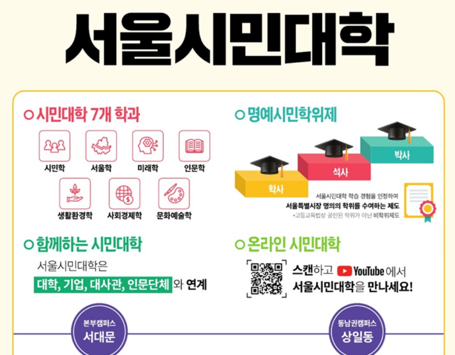서울시민대학은 시민학,서울학,미래학,인문학,생활환경학,사회경제학,문화예술학 7개 학과가 있습니다.