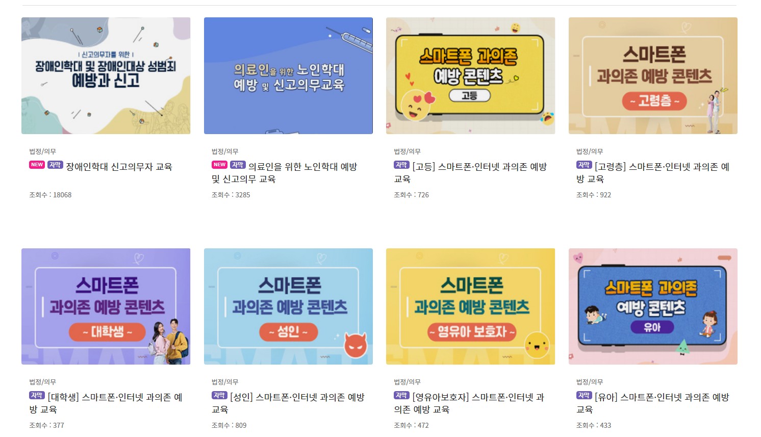 장애인학대 신고의무자교육과 노인학대 예방 및 신고의무교육,스마트폰 인터넷 과의존 예방교육,노후준비와 은퇴설계,어린이이용시설종사자 안전교육,직장내 괴롭힘 방지교육,직장내 장애인 인식개선교육,공인중개사 연수교육과정등을 무료로 이수 할수 있습니다.