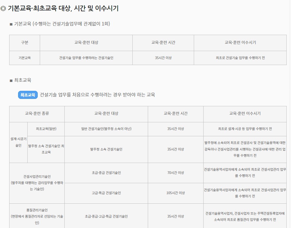 건설기술인이 최초로 건설기술 업무를 수행하기 위해서는 기본교육,전문교육의 최초교육을 이수해야합니다. 건설기술분야와 직무분야와 관계 없이 이수해야하는 최초교육은 한국건설기술인