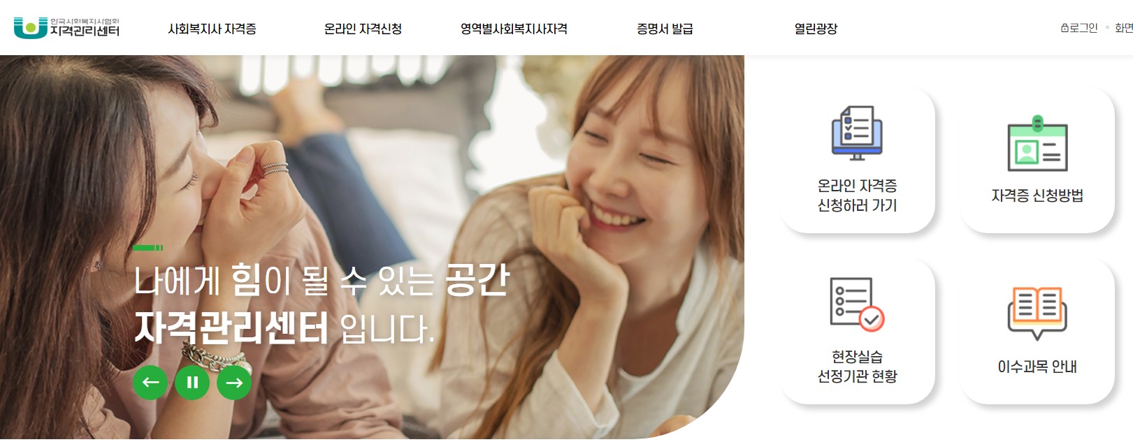 사회복지사 자격관리센터에서는 온라인 자격증 신청을 할수 있으며 증명서 발급과 영역별 사회복지사자격 기준을 확인 할수 있습니다.