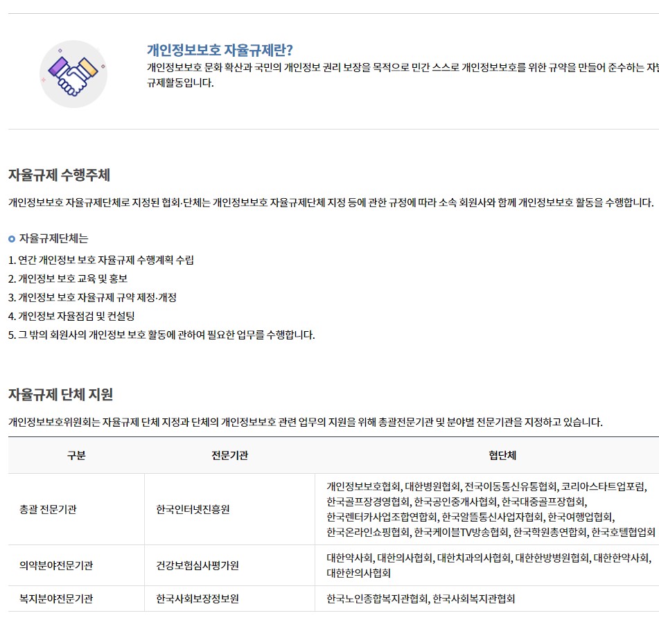 개인정보보호위원회에서는 자율규제 단체 지정과 단체의 개인 정보보호 관련 업무 지원을 위해 총괄 전문기관 및 분야별 전문기관을 지원하고 있습니다.