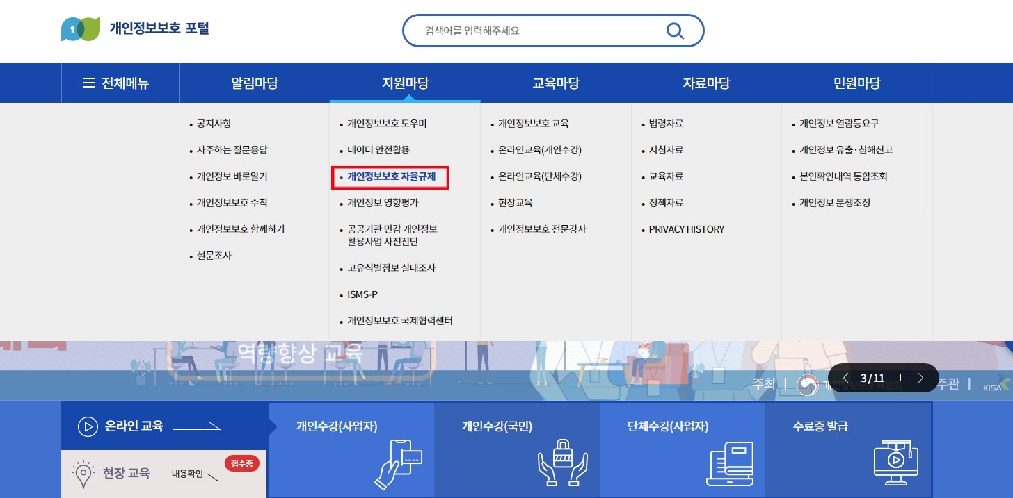개인정보보호포털에서는 개인정보보호 법정의무교육 온라인교육과 현장 교육 강사 지원을 신청 할수 있습니다.