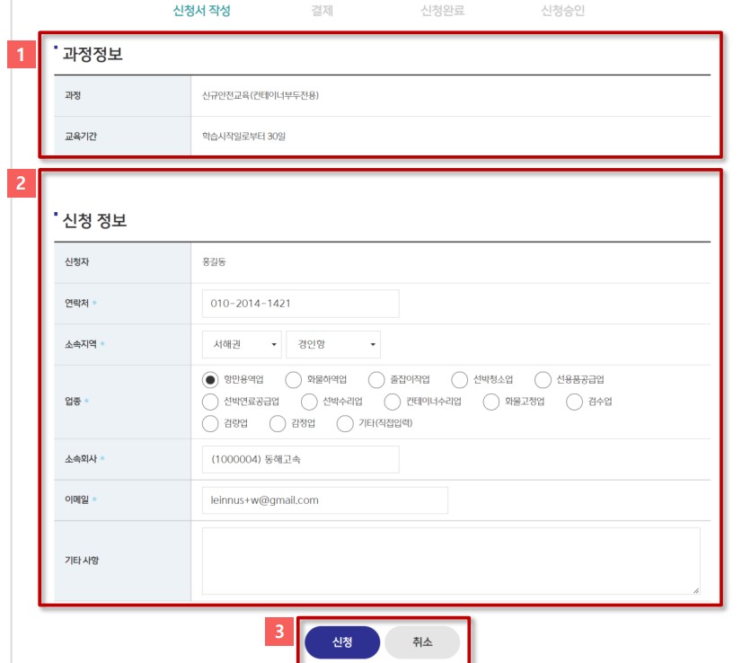 [신청하기]를 클릭후 과정정보와 신청정보를 입력합니다.