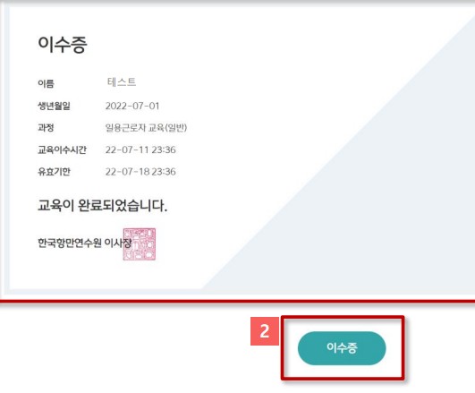 이수증을 확인후 이수증을 클릭하면 출력할 수 있습니다.