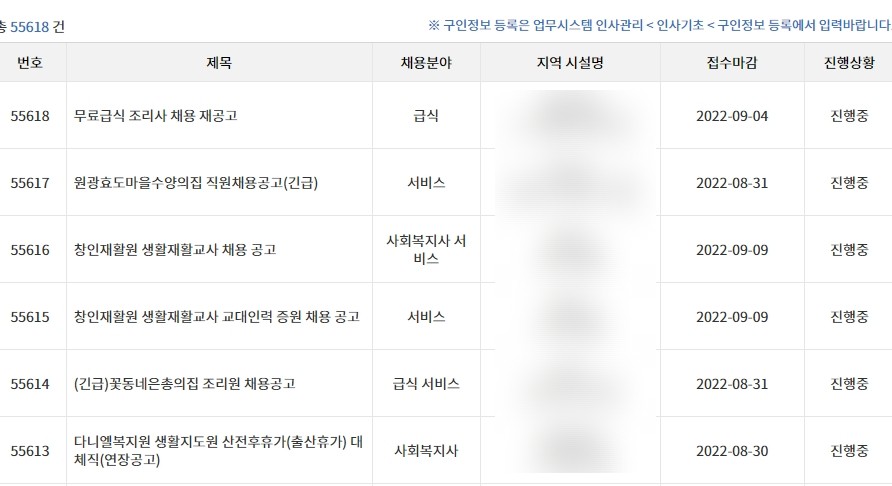 사회복지시설의 사회복지사나, 급식 조리원,생활재활교사,요양보호사 등 직원을 채용하는 공고도 확인 할수 있습니다.