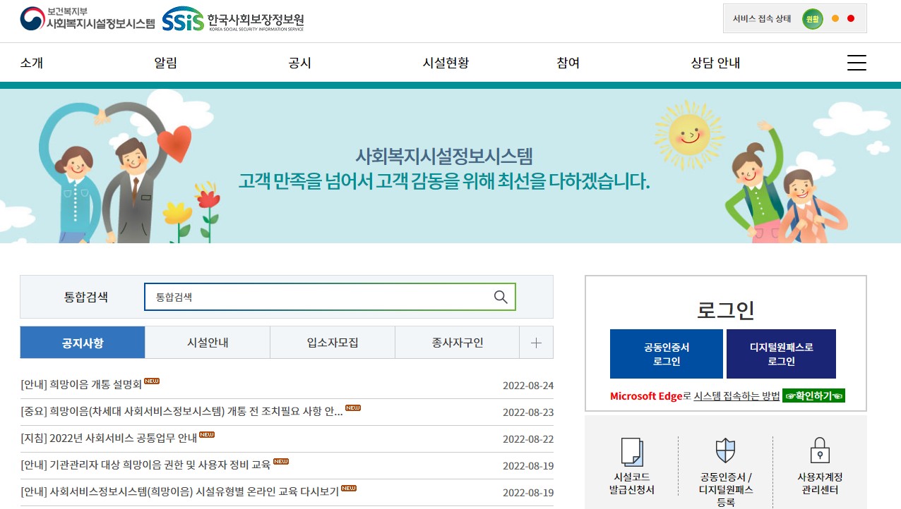 해당사이트는 한국사회보장정보원 행복e음과 연계되며 각종 복지시설 공시 정보와 시설현황, 구인구직,종사자 정보 확인등의 업무를 할 수 있습니다.