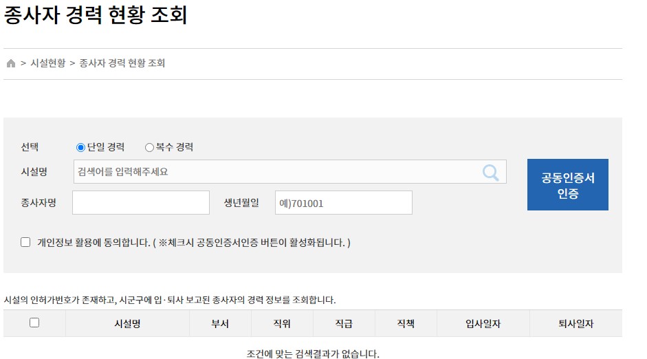 시설명과 종사자명,생년월일을 검색하면 시설명과 부서,직위,직책,입사일자,퇴사일자를 볼수 있습니다.