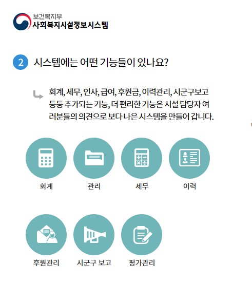 사회복지시설정보시스템에는 회계,세무,인사,급여,후원금,이력관리,시군구보고 ,평가관리,후원관리등을 편리하게 사용할 수 있습니다.