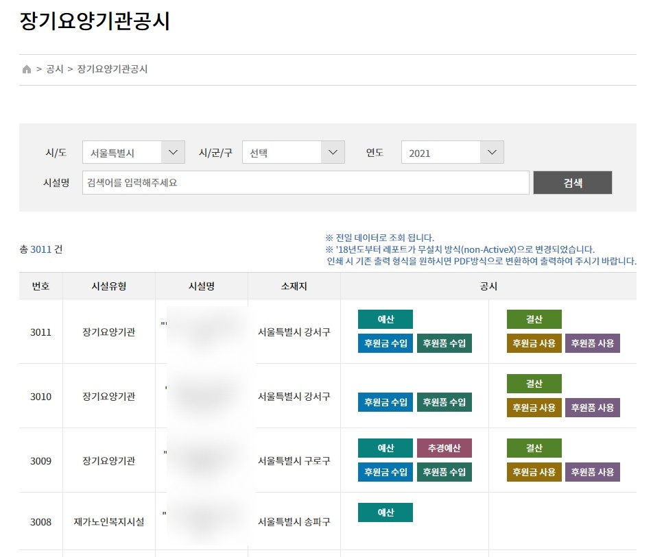 장기요양기관정보와 시설,법인 공시를 통해 예산과 후원금 수입,후원품수입현황,추경예산,결산의 공시를 자세히 확인 할수 있습니다,