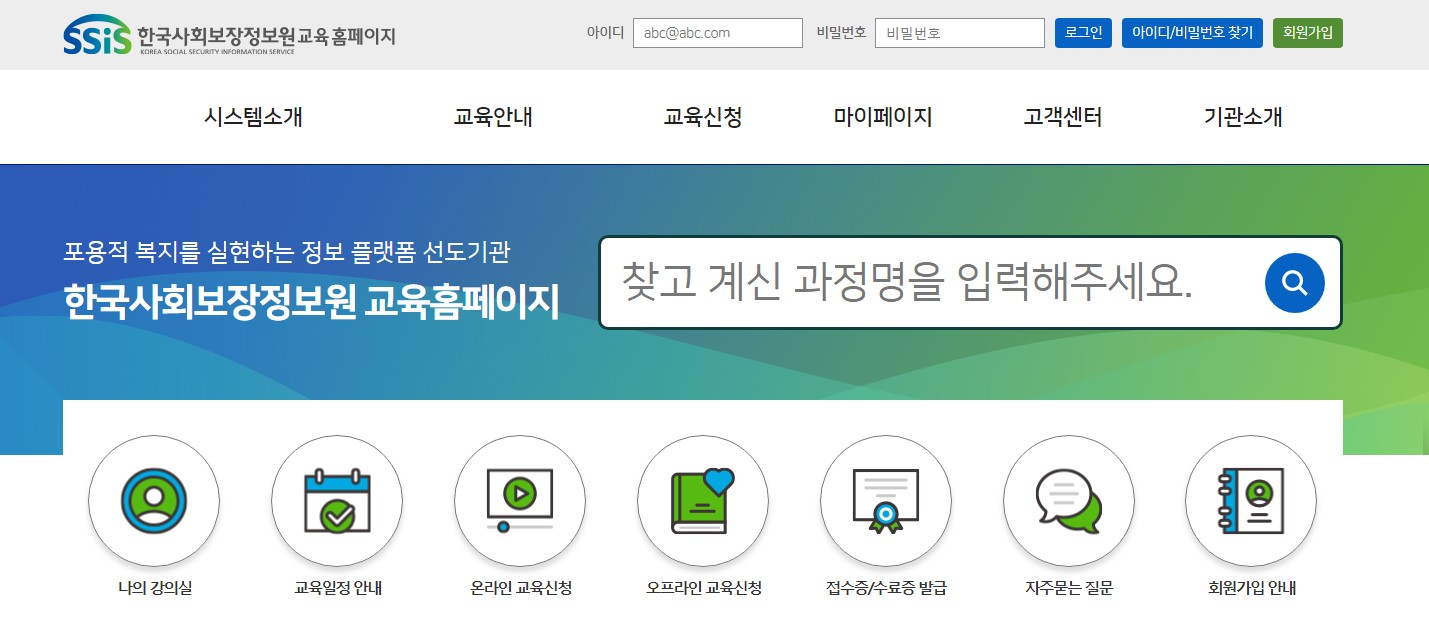 사회보장정보원 교육 홈페이지(edu.ssio.or.kr)에 접속하시면 사회복지 관련 업무를 하시는 분들이 사용하시는 시스템 사용 방법 교육을 온라인,오프라인으로 신청해 이수 할 수 있습니다.