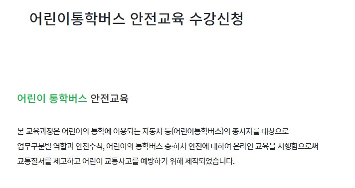 해당사이트 홈페이지에서는 고령운전자교육,통학버스교육,긴급자동차교육,교통안전교사 교육을 온라인으로 이수 할 수 있습니다.