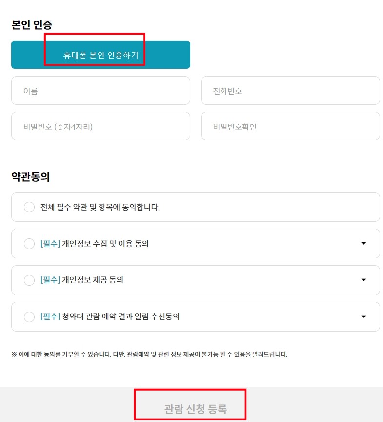약관동의 하고 '관람 신청 등록'을 선택합니다.