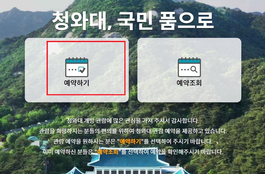 청와대 개방 관람 예약은 '청와대 국민 품으로' 홈페이지(www.opencheongwadae.kr)에서 간단히 예약 할 수 있습니다.