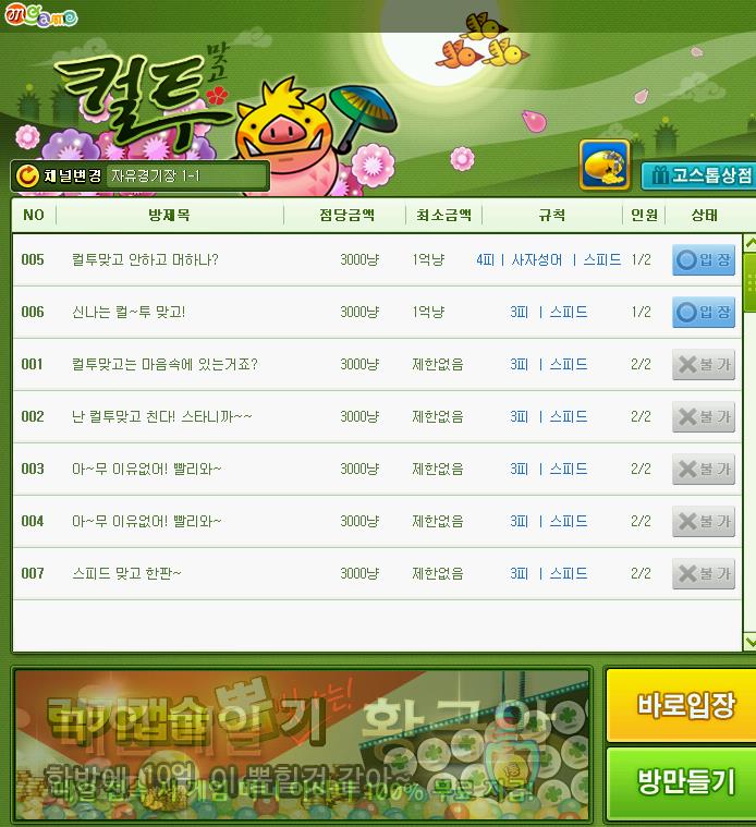 컬투 맞고 페이지로 넘어가면 상단에 자유경기쟁,점 5백냥방,점1천냔방 점3천냥방등 다양한 방등이 있네요.