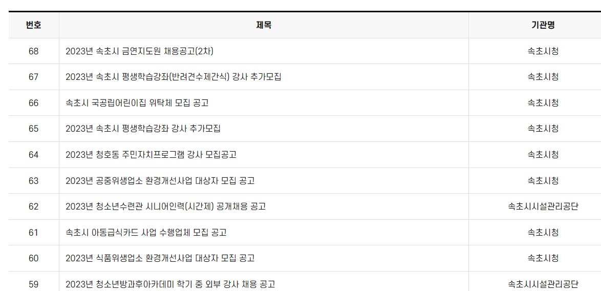 속초 시청 홈페이지(www.sokcho.go.kr)에서는 노인과 저소득층을 대상으로한 실버 시니어 공공근로 일자리 모집 정보도 확인 할 수 있습니다.