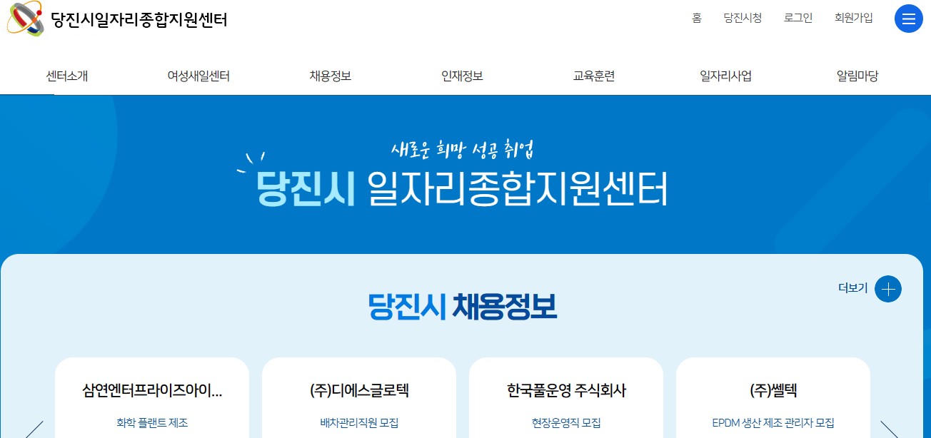 당진시일자리종합지원센터 사이트는 당진시의 다양한 채용정보와 직업교육훈련,집단상담프로그램, 여성인력 직업훈련,청년일자리,공공근로,지역공동체 일자리 사업에 대한 정보를 확인 할 수 있습니다.