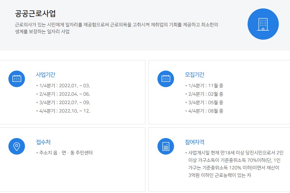 공공근로는 1년에 4차례 정도 모집하며 주소지 읍 면 동 주민센터에서 접수를 받습니다.