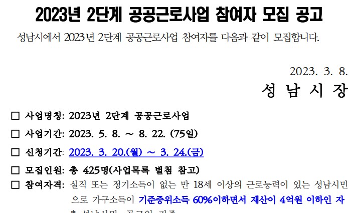 성남시 노인공공근로 모집공고 ( 신청기간, 방법, 자격)