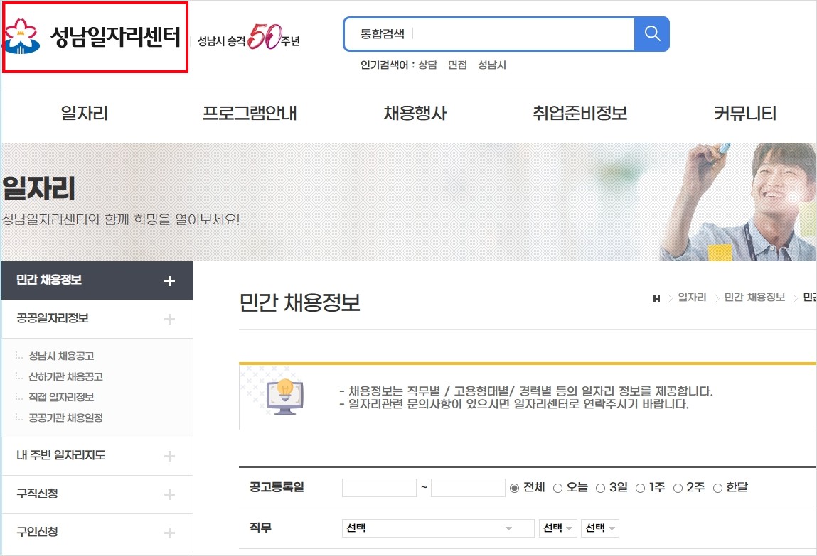 성남시 지역의 일자리 채용 정보는 성남일자리센터홈페이지(job.seongnam.go.kr)에서 다양한 성남시 일자리 구인구직 정보를 확인 할 수 있습니다.
