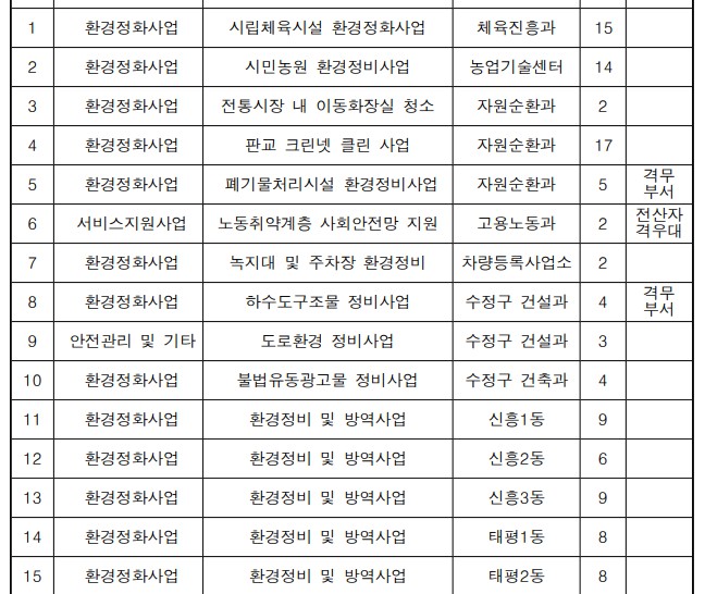 주로 환경정비사업,화장실청소,방역사업,도로환경 미화,잔디관리, 도로정비 등 업무를 모집합니다.