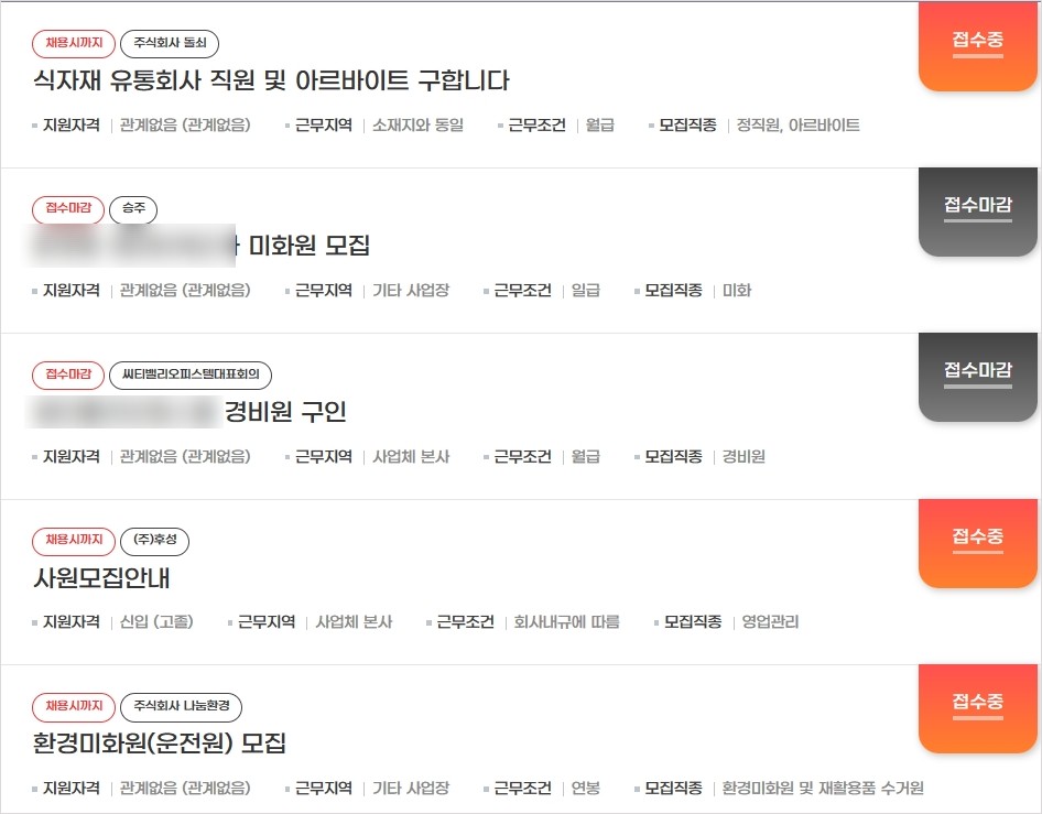 식자재 유통회사 직원및 미화원,경비원,취사원, 쇼핑몰, 서비스,요양보호사,사회복지사,간호조무사 등 사무보조 생산직 마트 직원,건물시설관리 물류 창고관리 등 다양한 직종의 일자리 조회가 가능합니다.
