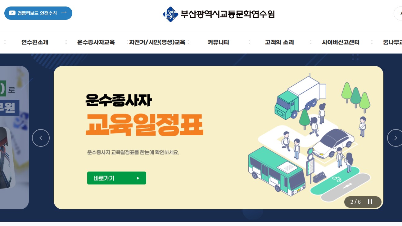 부산광역시 교통문화연수원은 부산지역의 교통안전교육과 택시,여객버스 신규교육 화물운수종사자 보수교육을 신청하고 이수 할수 있는 사이트 입니다. 부산지역 소속 화물 여객 운송종사자 분들은 부산광역시 교통문화연수원 화물운송보수교육 온라인 홈페이지를 확인하고 신청하시는게 좋습니다.