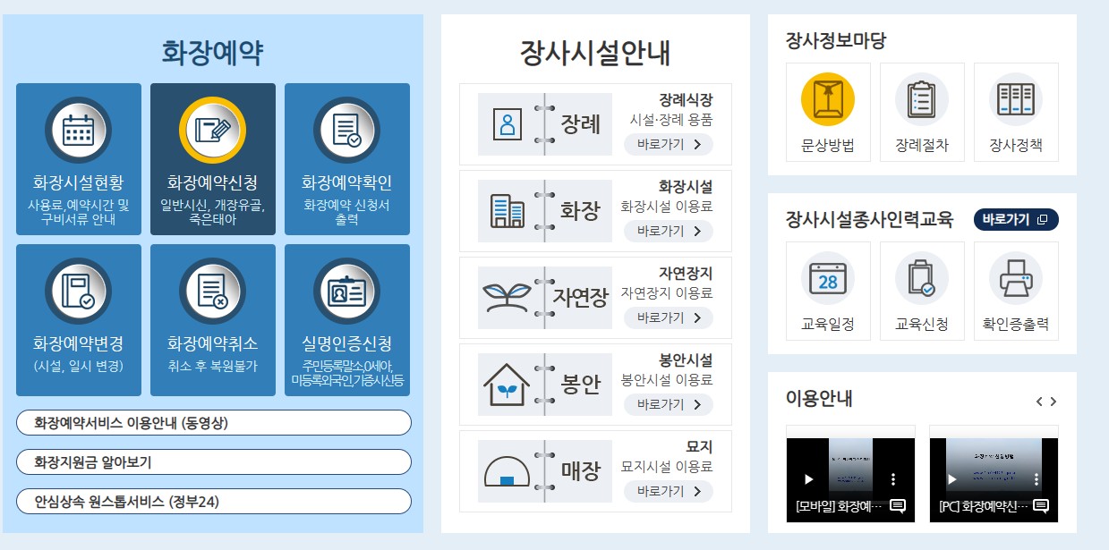 화장예약과 장사시설안내, 장사정보마당, 장사시설종사인력교육 을 한번에 조회 할수 있는 페이지입니다.