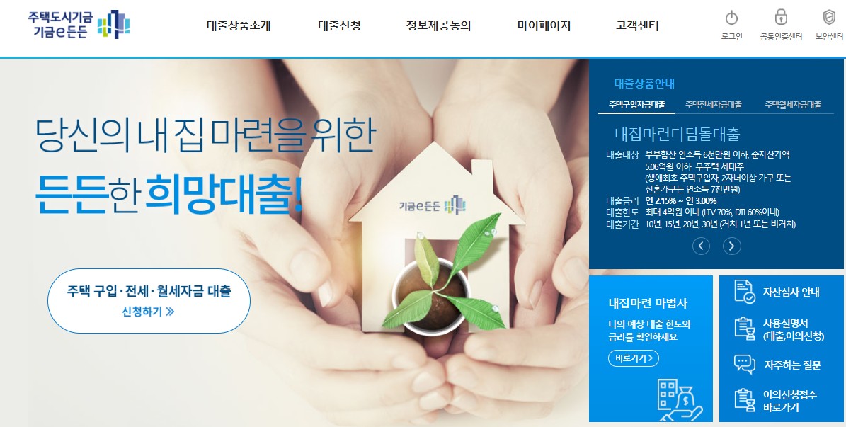 주택도시기금 기금e든든 홈페이지(enhuf.molit.go.kr)에 서는 전세자금,매매 자금,월세 자금등 을 신청해 낮은 이자로 이용할 수 있습니다.