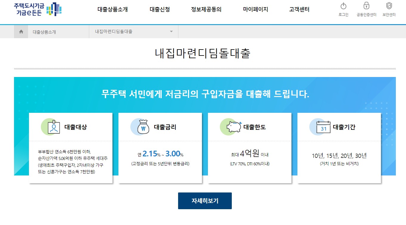 기금 e든든에서는 내집마련디딤돌대출, 신혼부부전용구입자금,오피스텔 구입자금, 버팀목 전세자금,신혼부부전용전세자금,중소기업청년전월세보증금대출, 청년전용 버팀목 전세자금, 청년전용 보증부 월세 대출, 주거안전 월세 대출등을 취급하고 있습니다.