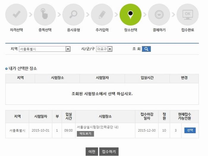 자격선택후 종목을 선택,응시유형과 추가입력을 다 한후 시험을 치를 장소를 선택합니다.